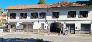 Restauro parziale della facciata di un edificio commerciale su strada, con stuccature, rasature e nuova tinteggiatura.